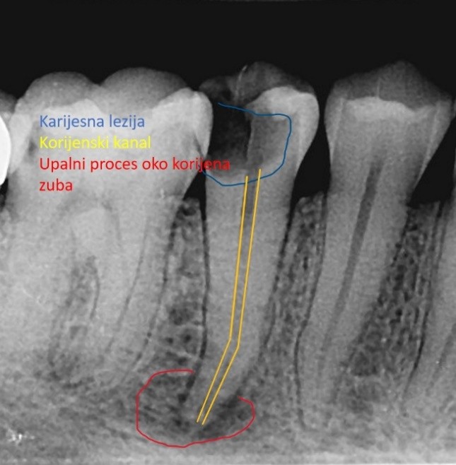 Prikaz velike karijesne lezije i upalnog procesa oko korijena zuba