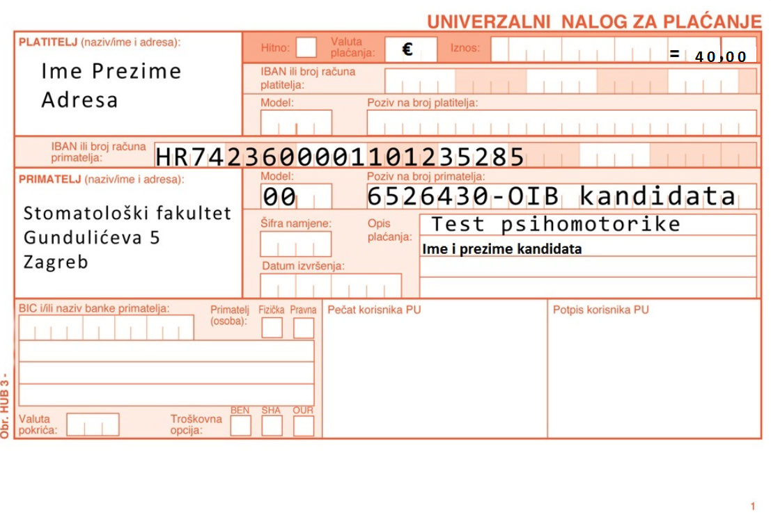 - Confirmation of payment (with the completed application, proof of payment of the costs of testing special abilities in the amount of 40.00 euros must be attached, which should be paid to IBAN HR7423600001101235285 University of Zagreb School of Dental Medicine, with the indication "for testing special abilities".