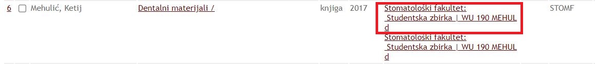 Otvorit će se prozor s prikazom svih dostupnih primjeraka tražene knjige. Uz svaki primjerak je naveden Status odnosno može li se posuditi (primjerak je na mjestu) ili je primjerak namijenjen korištenju u čitaonici.