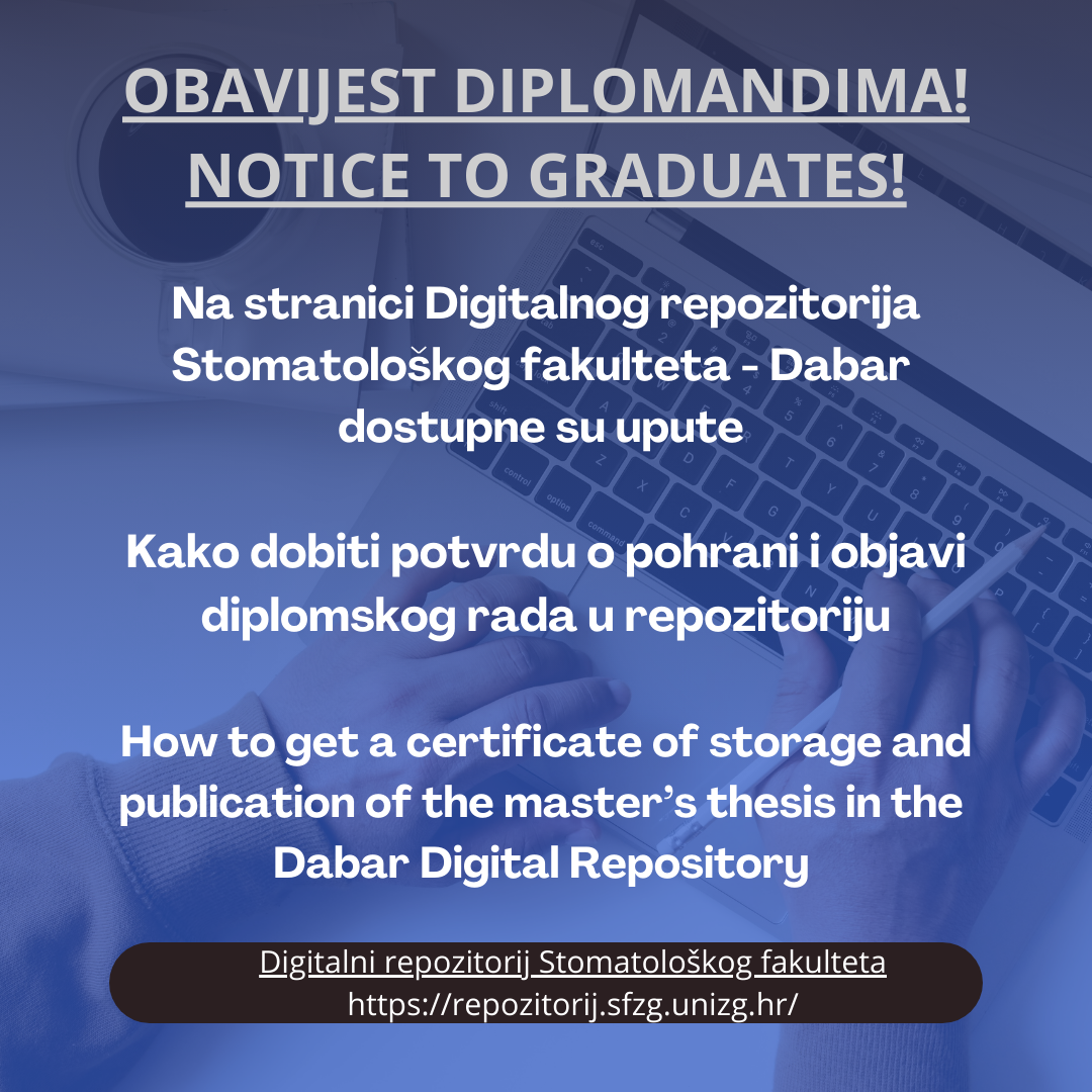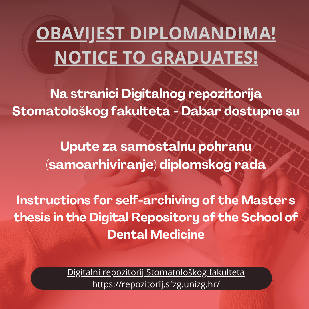 Pročitaj višeStudenti imaju obavezu sami pohraniti svoj diplomski rad u Digitalni repozitorij Stomatološkog fakulteta.