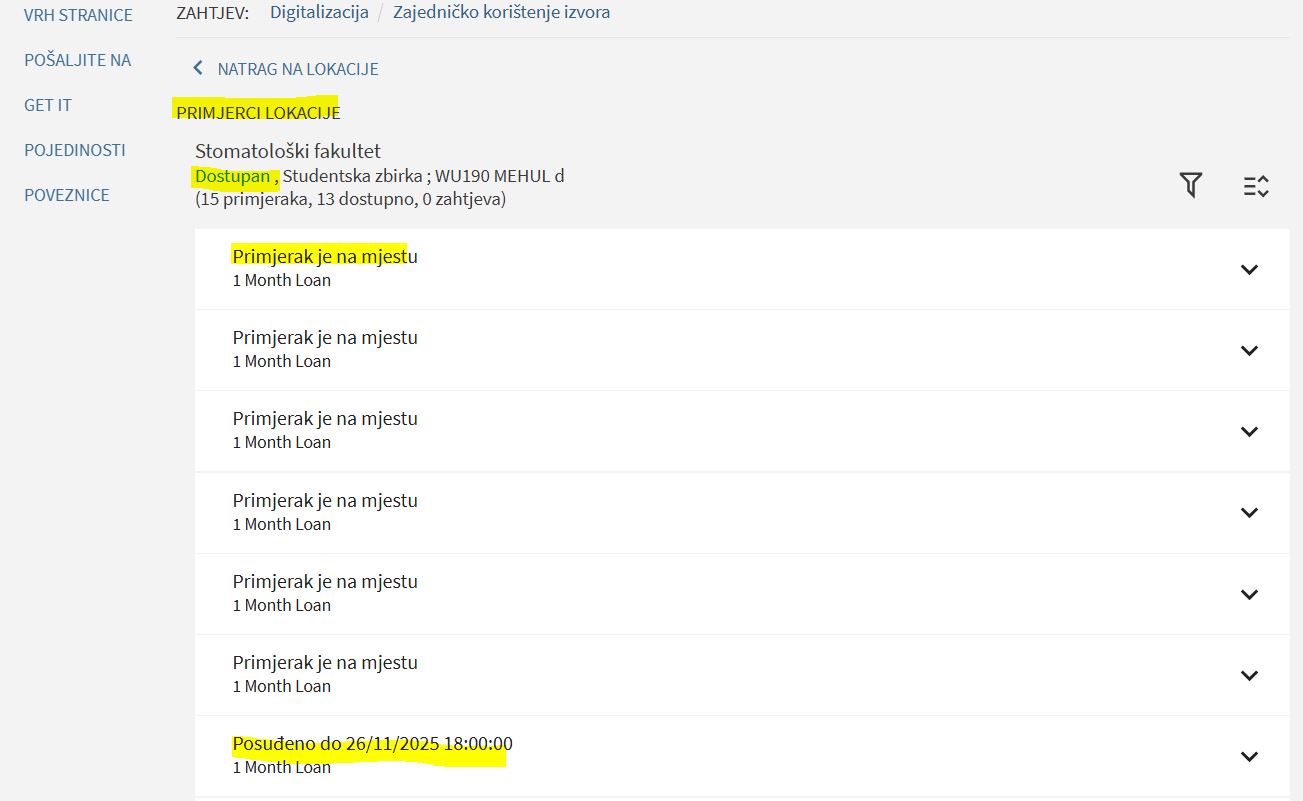 Otvorit će se prozor s prikazom svih dostupnih primjeraka tražene knjige. Uz svaki primjerak je naveden Status odnosno može li se posuditi (primjerak je na mjestu) ili je primjerak namijenjen korištenju u čitaonici.